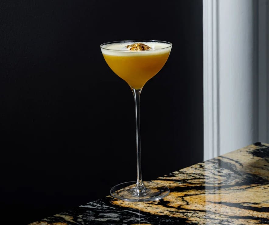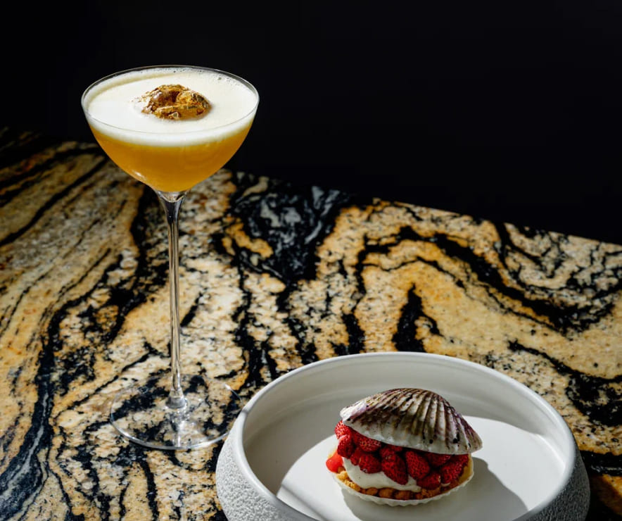 - Коньяк «Коктебель» 15 лет, персиковое пюре, персиковый сорбет, персиковый ликер, крем-сода, кордиал пало санто, игристое вино